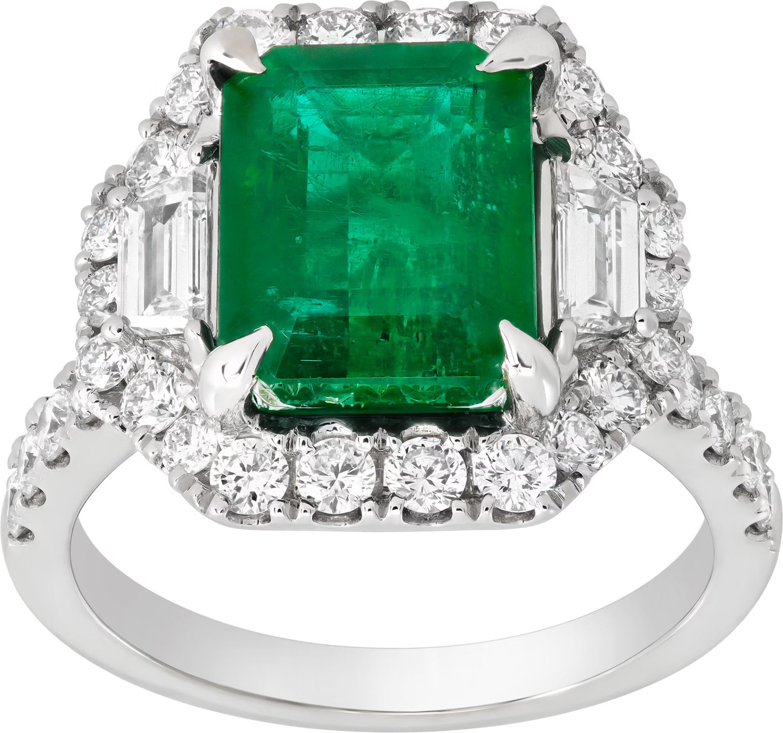 Emerald & diamond ring in 18k white gold with a center emerald cut Emerald (3.90 carats), accented with approximately 1.40 carats of round and baguette diamonds averaging G-H color, VS clarity. Size 6.