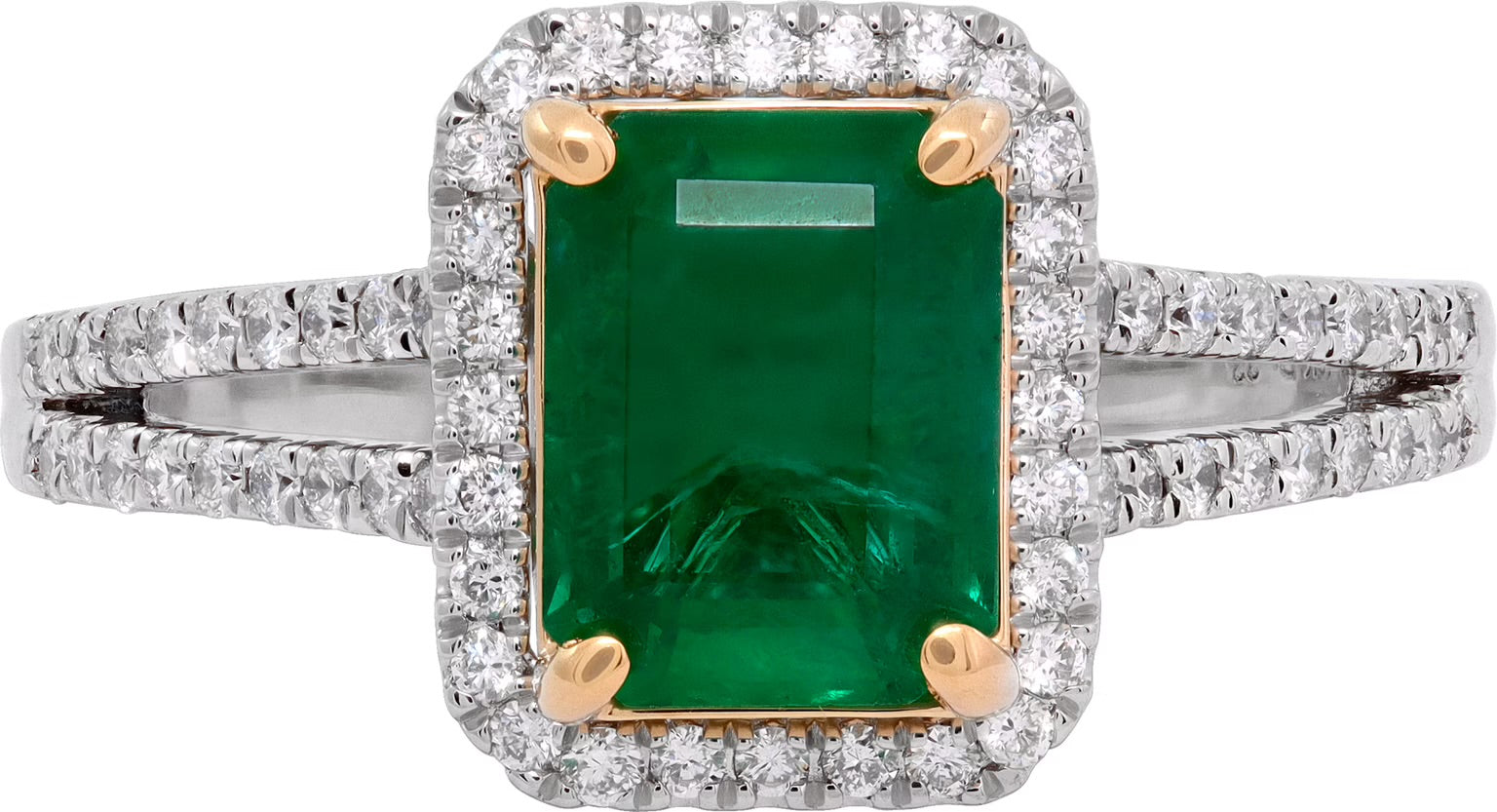 Emerald cut emerald & diamond ring in platinum & 18K yellow gold
