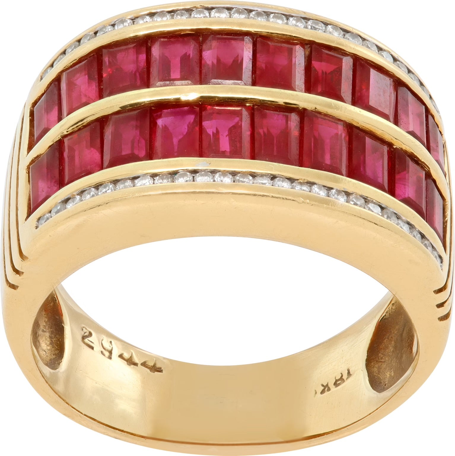 Ruby & diamond ring in 18k yellow gold.Chanel set baguettes rubies total approx. weight: 2.00 carats, Round brilliant cut diamonds, total approx. weight: 0.50 carat, white and eye clean.20mm center w x 12mm H (0.75 x 0.50 inch). Size 5.75.